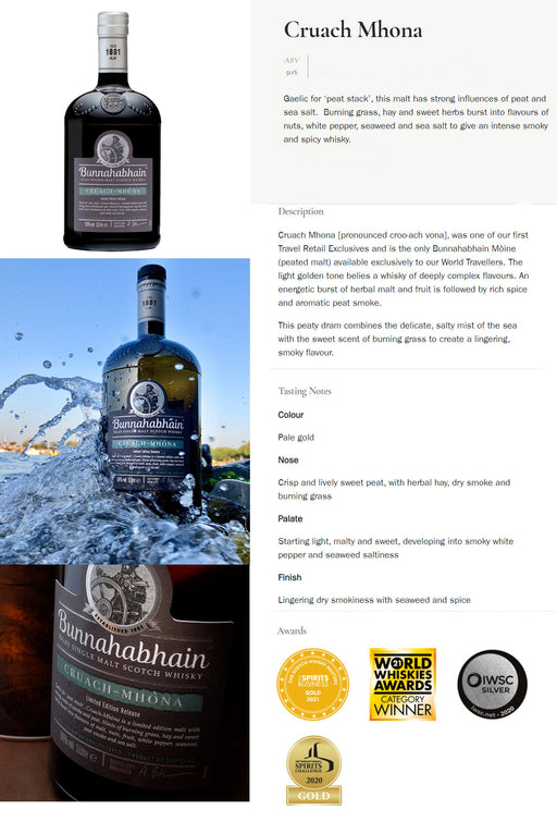 BunnahabhainDESCRIPTION Cruach Mhona [pronounced croo-ach vona], was one of our first Travel Retail Exclusives and is the only Bunnahabhain Mòine (peat...