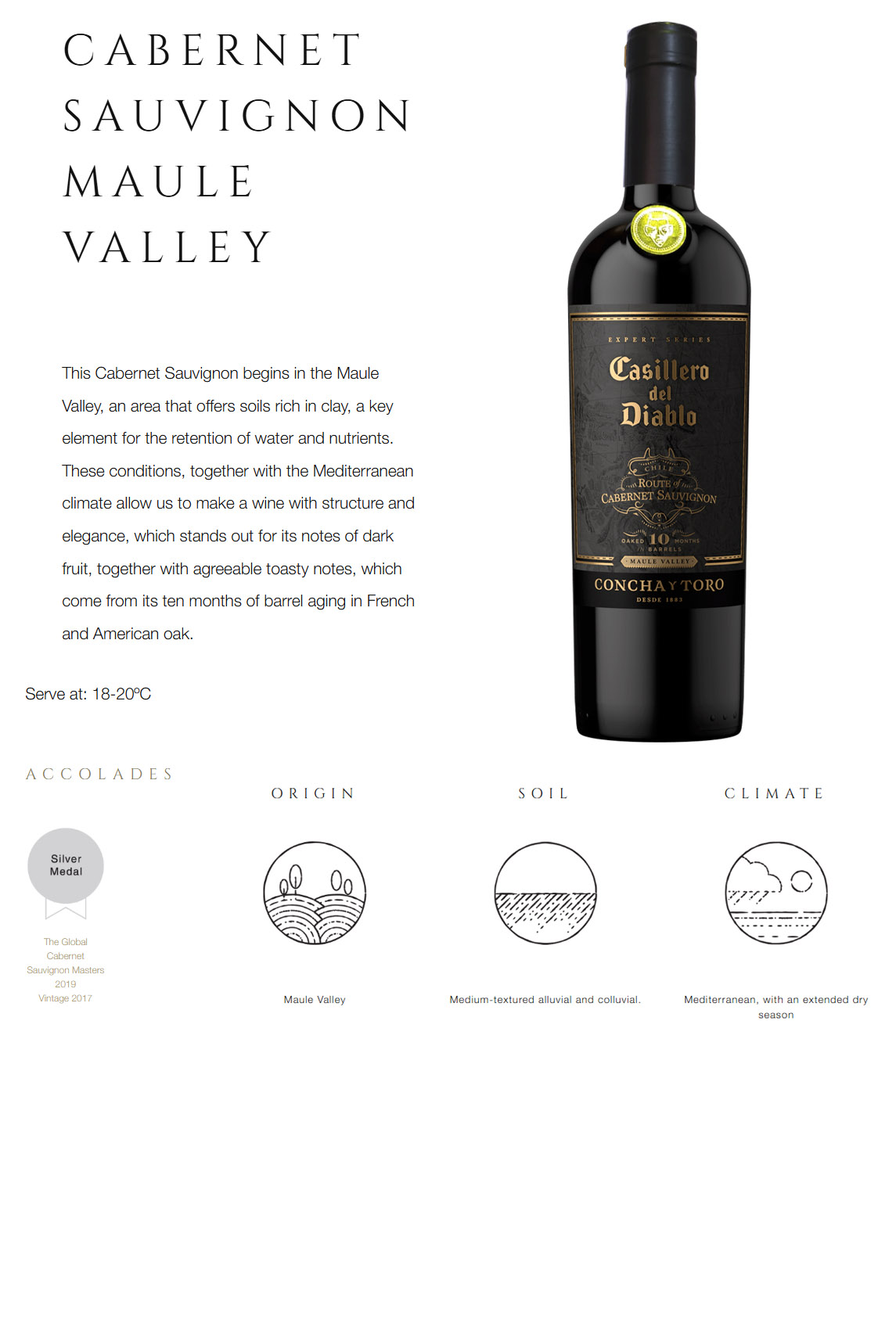 This Cabernet Sauvignon begins in the Maule Valley, an area that offers soils rich in clay, a key element for the retention of water and nutrients. These conditions, together with the Mediterranean climate allow us to make a wine with structure and elegance, which stands out for its notes of dark fruit, together with agreeable toasty notes, which come from its ten months of barrel aging in French and American oak.