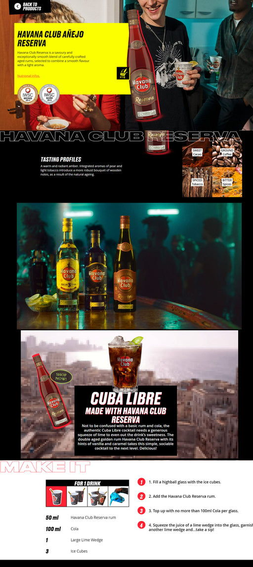 Havana ClubHavana Club Reserva is a savoury and exceptionally smooth blend of carefully crafted aged rums, selected to combine a smooth flavour with a light a...
