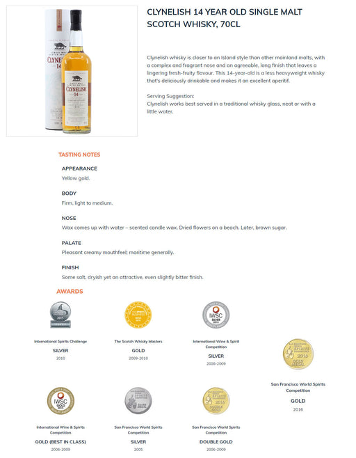 Original price $149.99Original price $149.99 - Original price $149.99Original price $149.99Current price $107.99$107.99 - $107.99Current price $107.99Clynelish 14 years Single Malt Scotch Whisky 46% 700ml