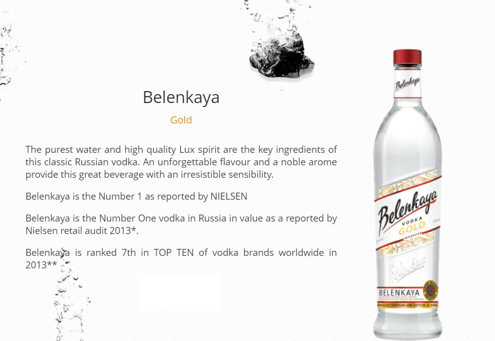 A popular Russian vodka brand, Belenkaya Gold endures a lengthy filtration through 13 metres of coal before it is bottled. This process results in a fantastically pure vodka with a soft, balanced palate. It is no surprise, then, that the name means "clearest and purest".