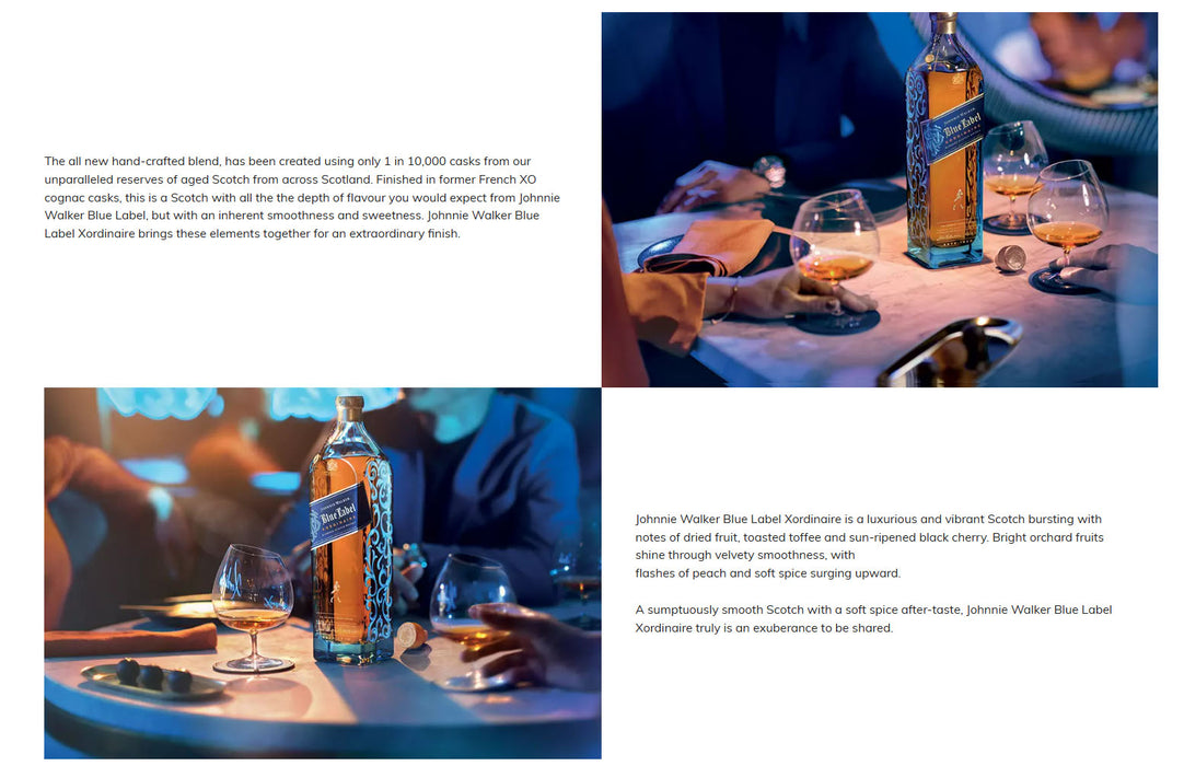 Finished in former French XO cognac casks, this is a Scotch with all the depth of flavor you would expect from Johnnie Walker Blue Label, but with an inherent smoothness and sweetness. Johnnie Walker Blue Label Xordinaire brings these elements together for an extraordinary finish.