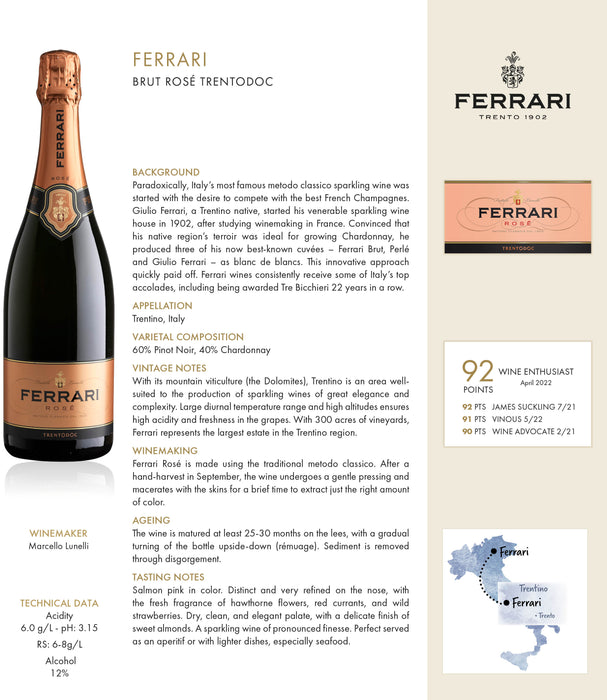 Ferrari Rosé is made using the traditional metodo classico. After a hand-harvest in September, the wine undergoes a gentle pressing and macerates with the skins for a brief time to extract just the right amount of color.