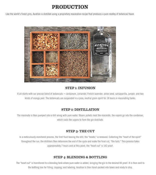 Aviation American Gin. Like the world's finest gins, Aviation is distilled using a proprietary maceration recipe that produces a pure medley of botanical flavor.
