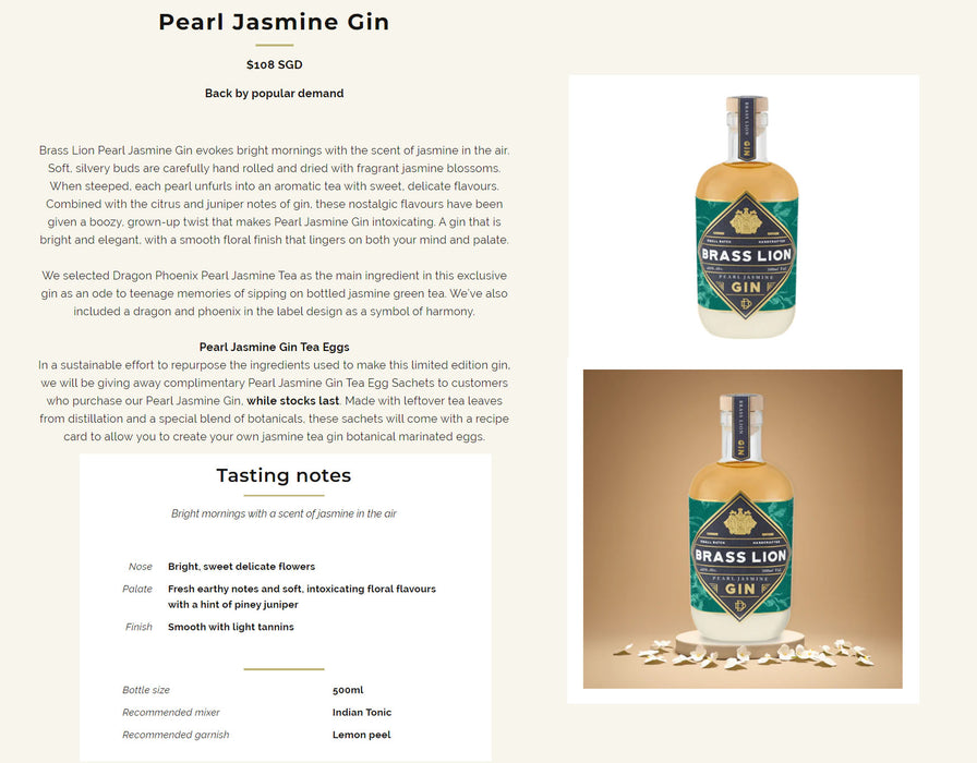Brass Lion Pearl Jasmine Gin evokes bright mornings with the scent of jasmine in the air. Soft, silvery buds are carefully hand rolled and dried with fragrant jasmine blossoms. When steeped, each pearl unfurls into an aromatic tea with sweet, delicate flavours. Combined with the citrus and juniper notes of gin, these nostalgic flavours have been given a boozy, grown-up twist that makes Pearl Jasmine Gin intoxicating. A gin that is bright and elegant, with a smooth floral finish that lingers on both your mind and palate.