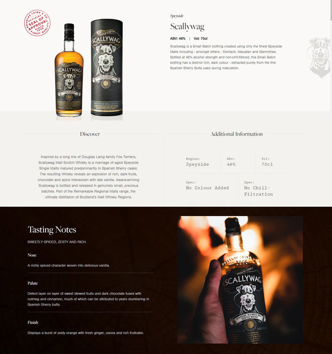 Scallywag is a Small Batch bottling created using only the finest Speyside Malts including - amongst others - Mortlach, Macallan and Glenrothes. Bottled at 46% alcohol strength and non-chill-filtered, this Small Batch bottling has a distinct rich, dark colour - extracted purely from the fine Spanish Sherry Butts used during maturation.