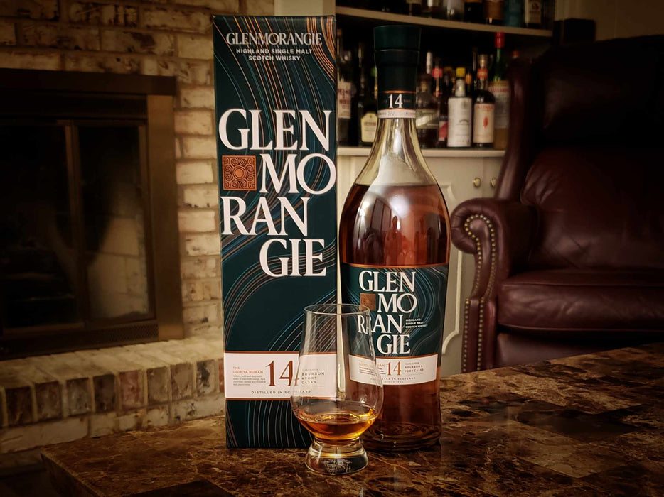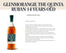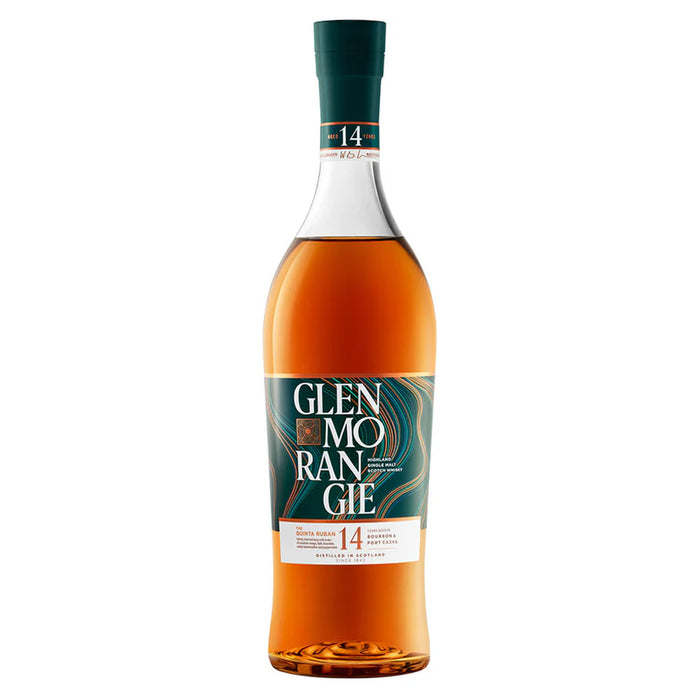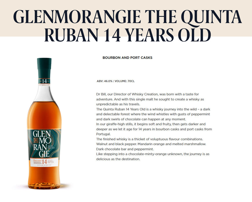Glenmorangie 14 Years Old Quinta Ruban. A full-bodied, silky-smooth single malt from Glenmorangie, finished in a Quinta Ruban port cask, creating a rich chocolate flavour. Gentle aromas of Seville oranges and walnut build into rich dark chocolate, sandalwood and spicy pepper. The palate initially offers notes of mint chocolate, walnuts and orange develop into Turkish delight and summer flowers.