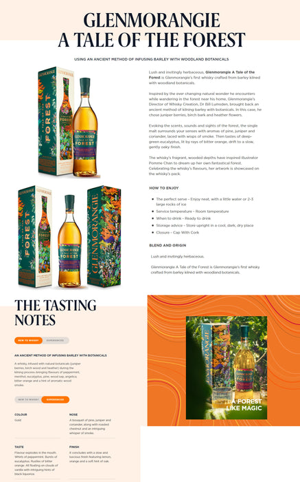Lush and invitingly herbaceous, Glenmorangie A Tale of the Forest is Glenmorangie’s first whisky crafted from barley kilned with woodland botanicals.