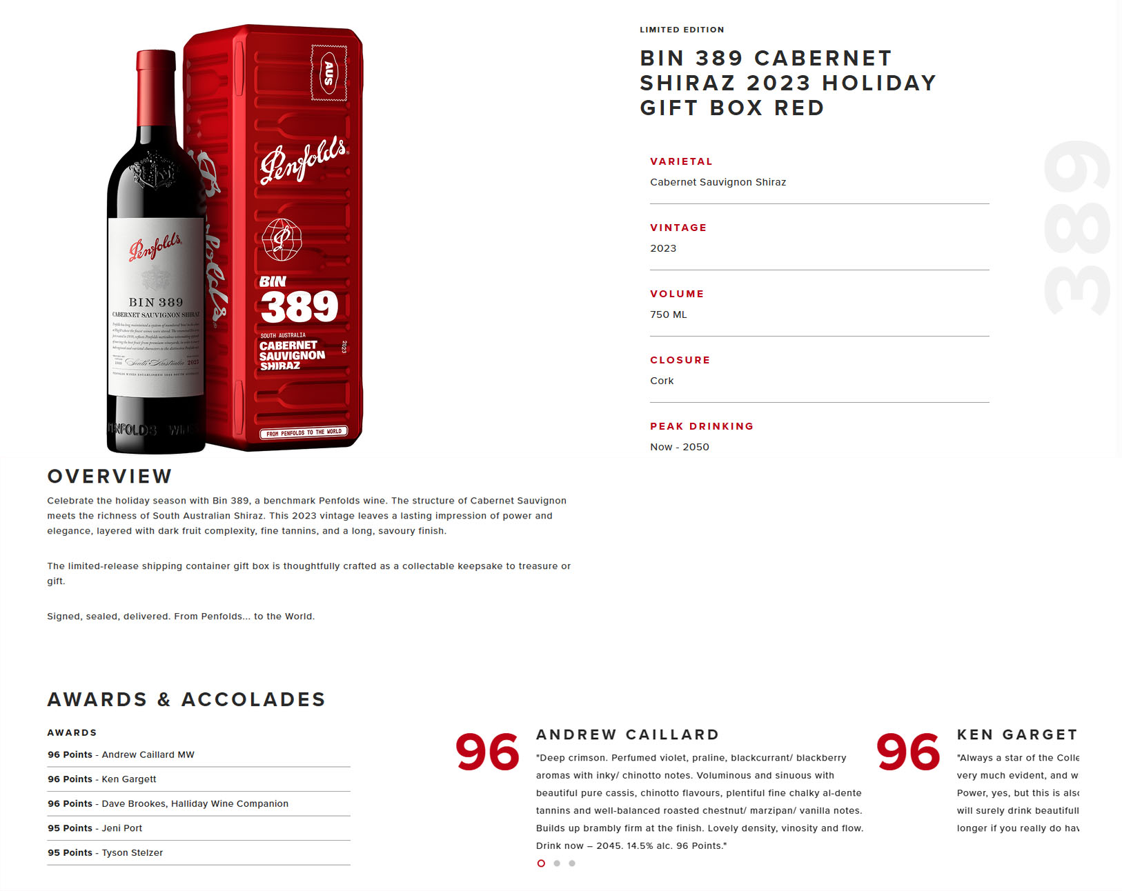 Celebrate the holiday season with Bin 389, a benchmark Penfolds wine. The structure of Cabernet Sauvignon meets the richness of South Australian Shiraz. This 2023 vintage leaves a lasting impression of power and elegance, layered with dark fruit complexity, fine tannins, and a long, savoury finish.