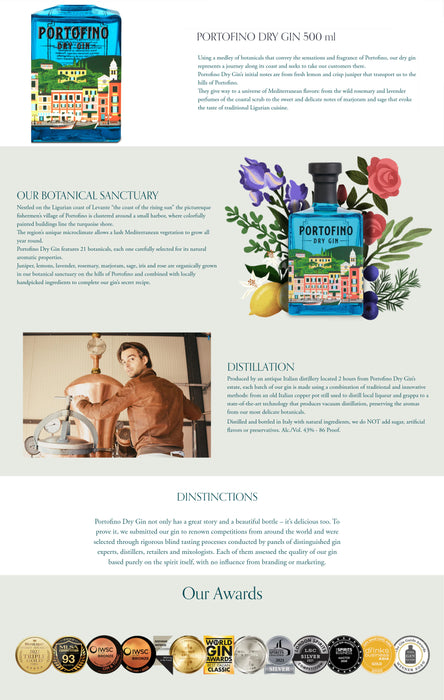 Combining carefully selected botanicals, Portofino Dry Gin takes you on an unforgettable journey along the Italian Riviera. Its initial notes are fresh lemon and crisp juniper that transport you to the hills of Portofino. These give way to a universe of Mediterranean flavours: from the wild rosemary and lavender perfumes of the coastal scrub to the sweet and delicate notes of marjoram and sage that evoke the taste of traditional Ligurian cuisine.