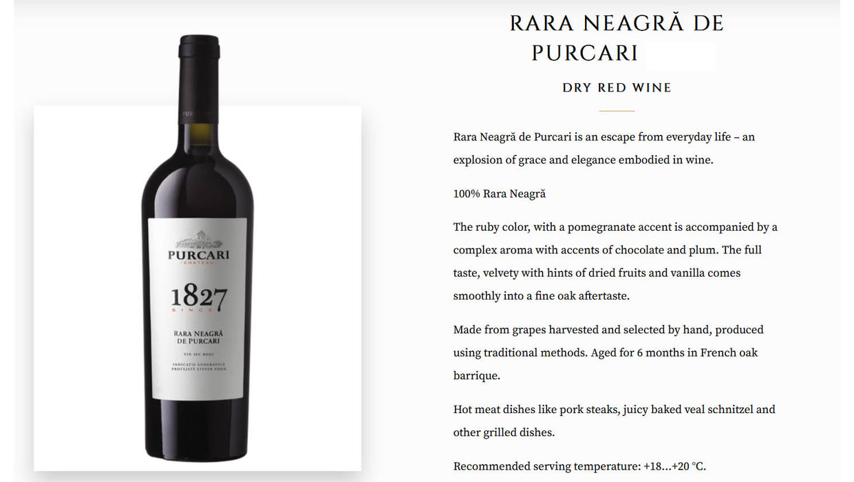 Rara Neagră is a rare local grape mostly exclusively planted in Moldova and Romania (also known as Băbească Neagră). The only known planting of it outside of Romania/Moldova is in up state New York in the US. Rara Neagră de Purcari is an explosion of grace and elegance embodied in wine, a perfect balance of power and elegance. Made from grapes harvested and selected by hand, produced using traditional methods.