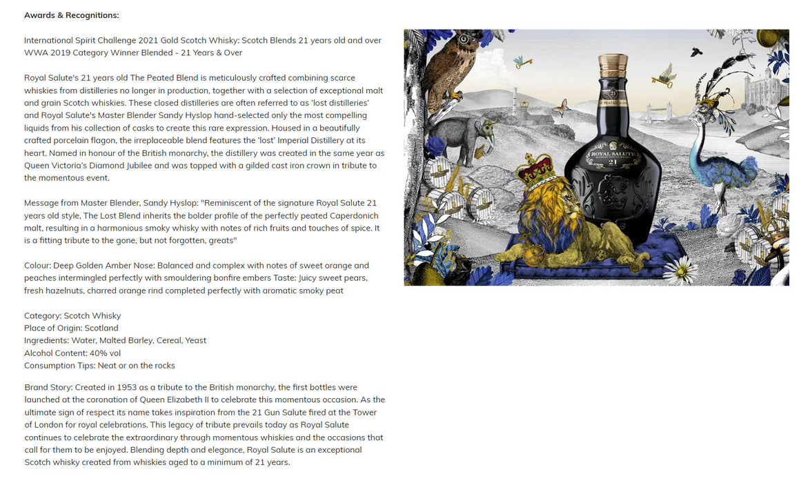 Brand Story: Created in 1953 as a tribute to the British monarchy, the first bottles were launched at the coronation of Queen Elizabeth II to celebrate this momentous occasion. As the ultimate sign of respect its name takes inspiration from the 21 Gun Salute fired at the Tower of London for royal celebrations. This legacy of tribute prevails today as Royal Salute continues to celebrate the extraordinary through momentous whiskies and the occasions that call for them to be enjoyed. Blending depth and elegance, Royal Salute is an exceptional Scotch whisky created from whiskies aged to a minimum of 21 years.
