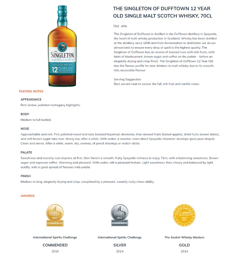 The 12 year smooth, naturally rich Single Malt Scotch Whisky has sweet fruity notes and a lingering, pleasurable warmth. It is matured in European and American Casks and monitored closely by the experts at Dufftown to ensure the consistency of the flavours.