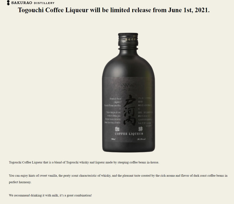Togouchi Whisky Coffee Liqueur ABV 18% 500ml